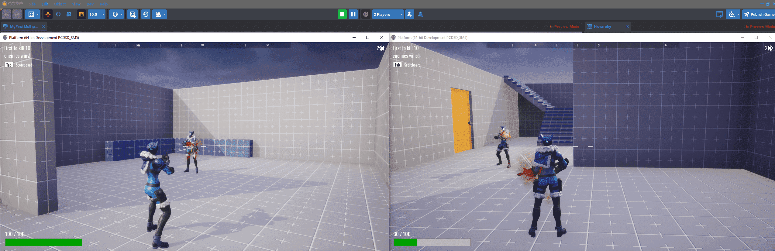 2. - Lancez un aperçu multijoueur de votre jeu, et vérifiez si vous gagnez en abattant un adversaire deux fois.
