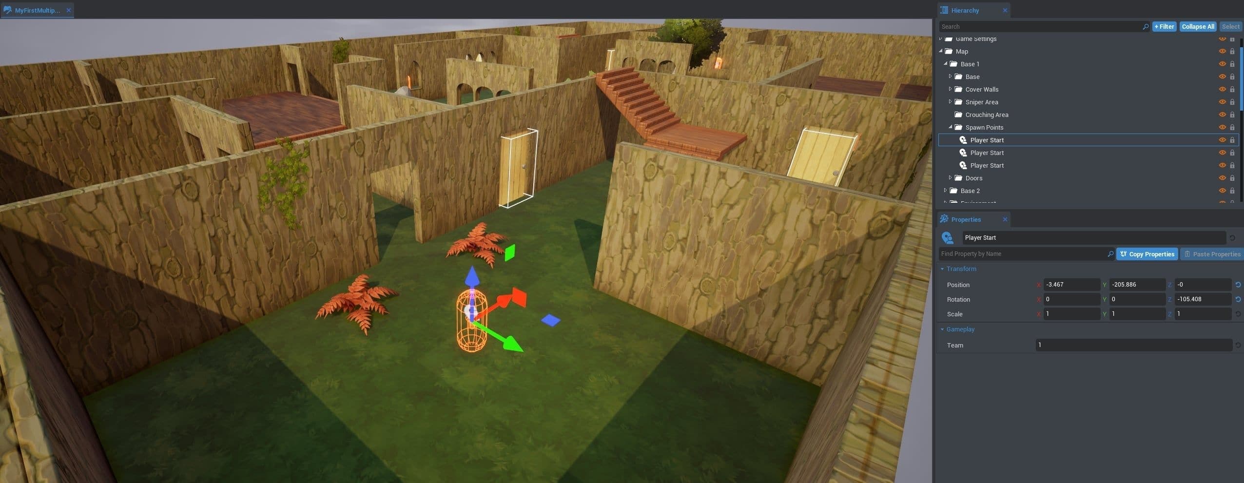 Déplaçons le "point de départ des joueurs" afin que les joueurs apparaissent plus loin les uns des autres. Appuyez sur V pour activer/désactiver l'affichage des éléments cachés; vous pouvez désormais voir la caméra, les points d'apparition et les zones de déclenchement.