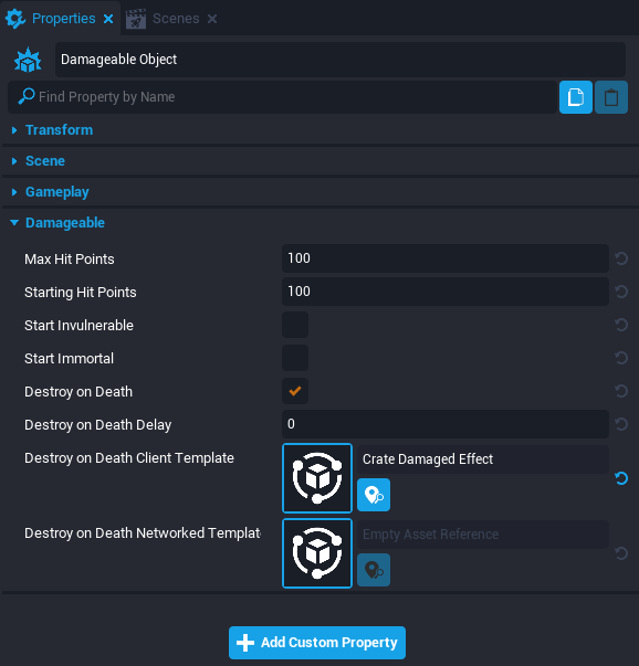 4. Click the Find in Asset Catalog button Icon Find next to the Destroy on Death Client Template property. The Project Content window should open with the Crate Damaged Effect template highlighted.