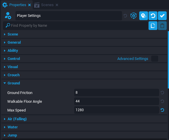 You can continue exploring the other sections of the Property window to see all player settings. One example is changing the Jump Max Count to 2 which enables double jumping.
