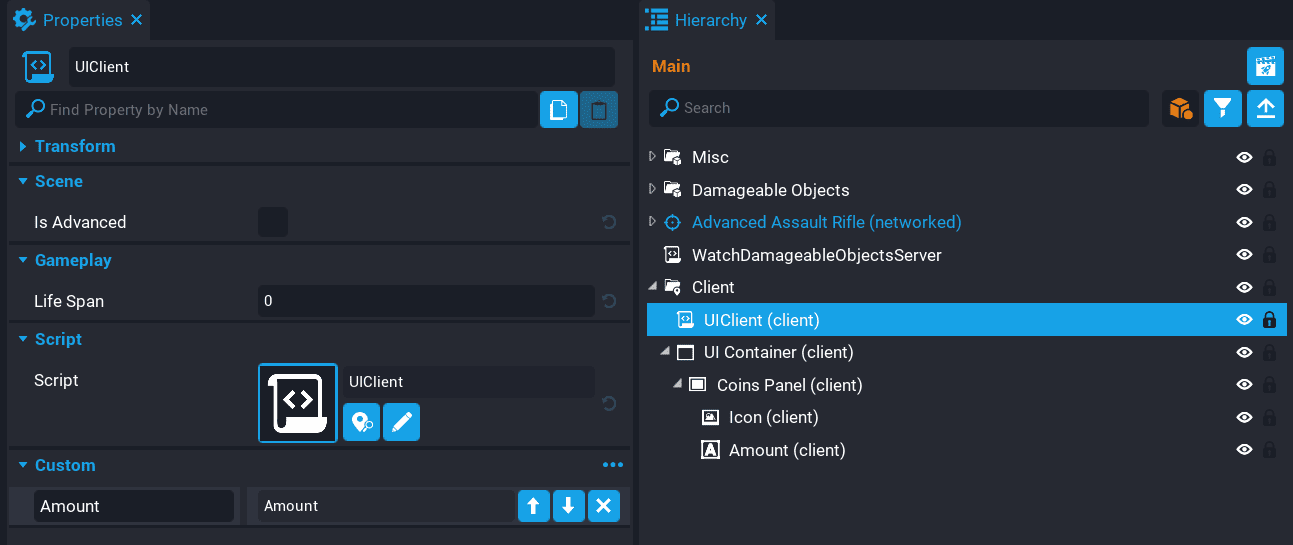 Add the Amount text object to the UIClient script as a custom property. Name it Amount.