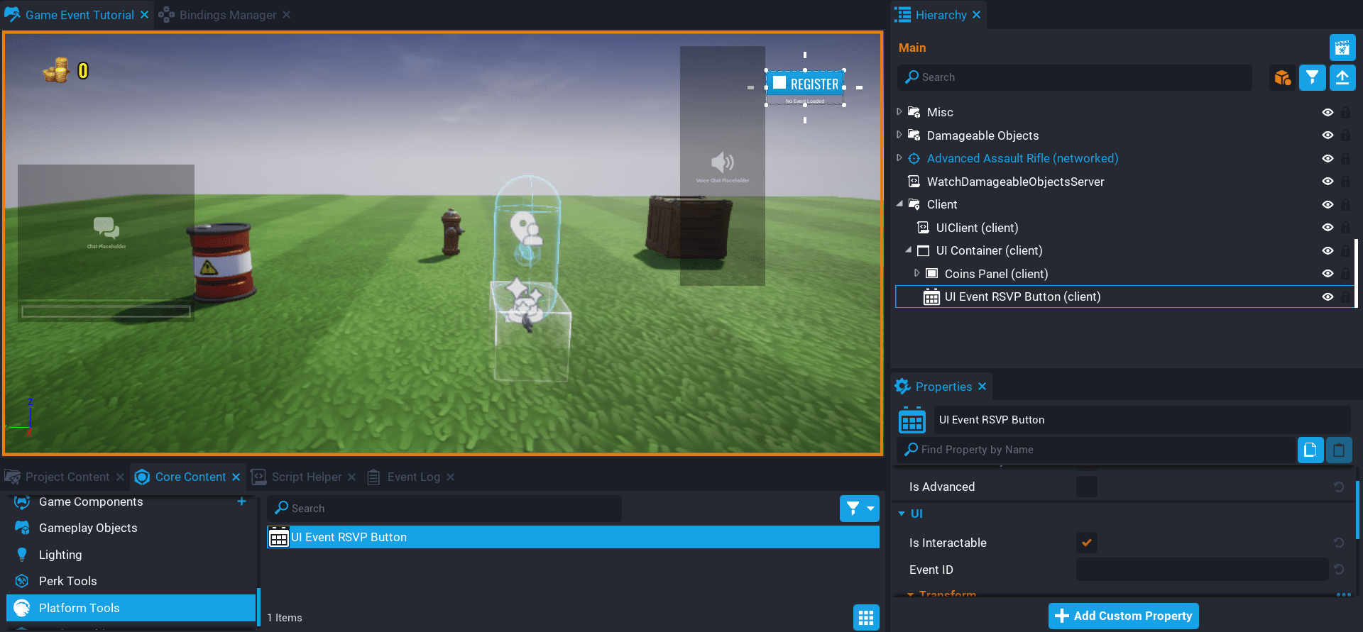 Add the UI Event RSVP Button from Platform Tools in Core Content to the UI Container you created earlier. Later on you will be adding the game event ID to the Event ID property in the Properties window. For the moment, the button will tell you that there is no game event loaded.