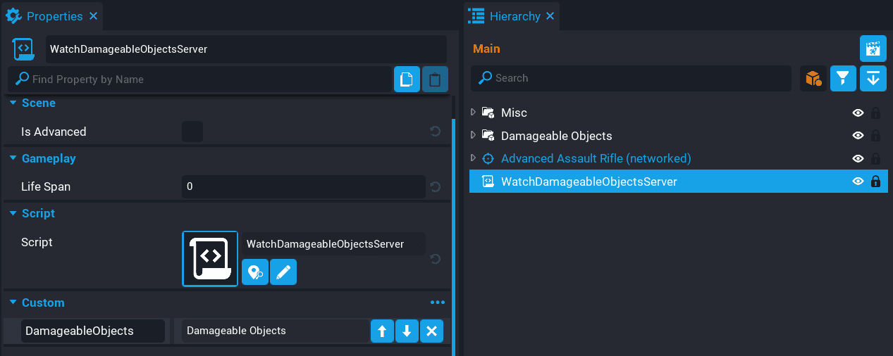 The WatchDamageableObjectsServer needs to know about the Damageable Objects group in the Hierarchy. So drag the Damageable Objects group onto the WatchDamageableObjectsServer script as a custom property. Name the custom property DamageableObjects.