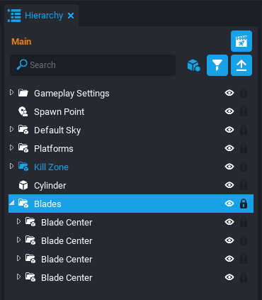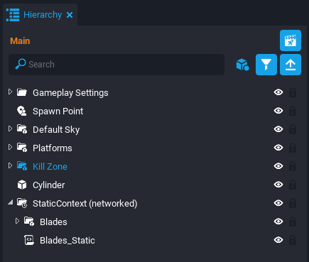 Create a new script by pressing the Script button Script above the scene. Name it MovingPlatform_Server. In the Project Content window, find the MovingPlatform_Server script in the My Scripts folder and drag it into the Hierarchy.