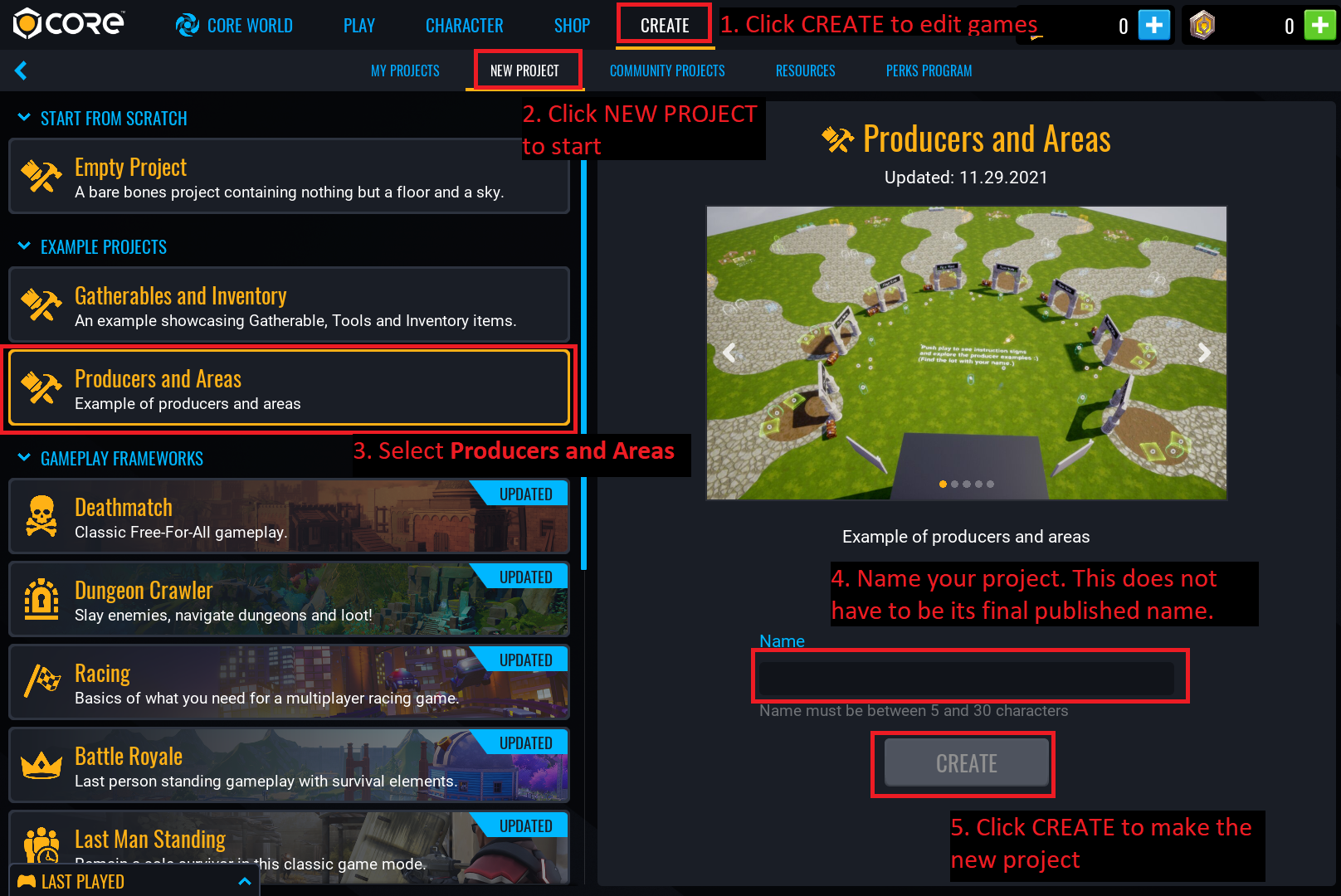 The Producers, Buffs and Areas Example Project can be found in the CREATE menu alongside the Empty and Framework project options.