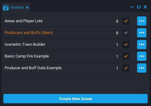 The project is divided into Scenes which showcase different ways the Producers, Buffs and Areas systems can be used to create gameplay. To access the Scenes window, click Window in the top menu bar and select Scenes. Double-click the Basic Camp Fire Example to the load the correct scene.