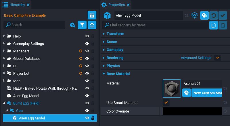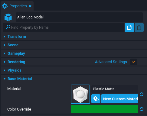 - Select the Alien Egg Model inside the Incubating Egg (Ready) and open the Properties window.