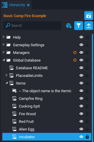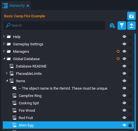 In the Hierarchy, open the Global Database folder and then expand the Items script. Any item that is placed in the inventory needs data in this group. Right click the Red Fruit script and select Duplicate. Rename the duplicated Red Fruit script to Alien Egg.
