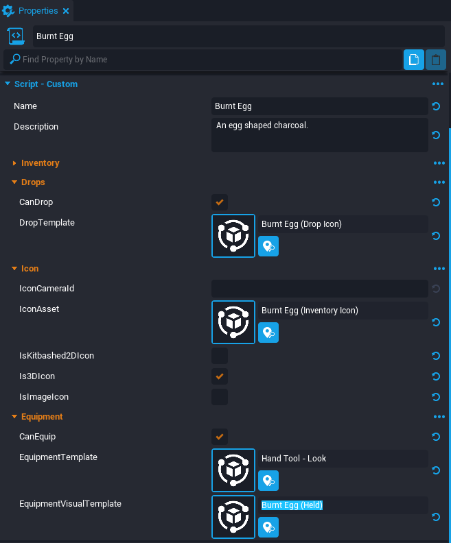Alien Eggscript and open the Properties window. - Set the DropTemplate property to Alien Egg (Drop Icon).