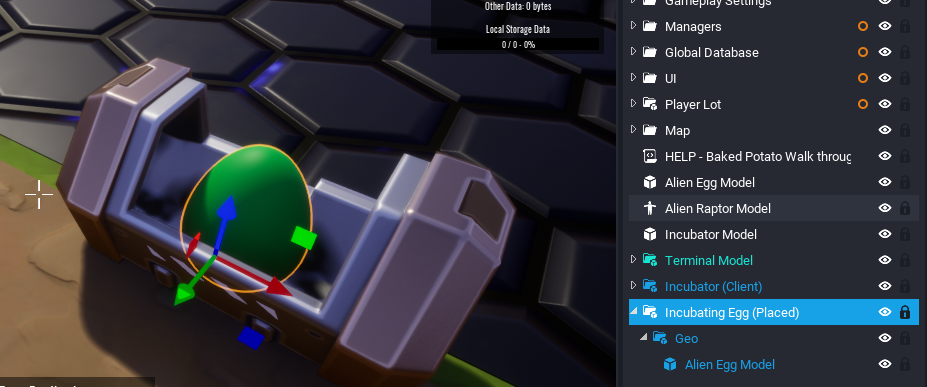 Select the Alien Egg Model inside the Incubating Egg (Placed) and open the Properties window. Set the Color Override property to a lighter color. Right click Incubating Egg (Placed) and select Create New Template From This. Name the template Incubating Egg (Building).