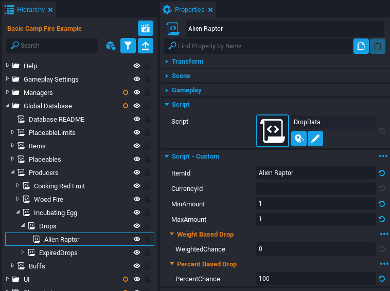 Expand the Incubating Egg script and then expand the Drops script. Rename the Cooked Fruit script to Alien Raptor. Select the Alien Raptor script and open the Properties window. Set the ItemId property to Alien Raptor.