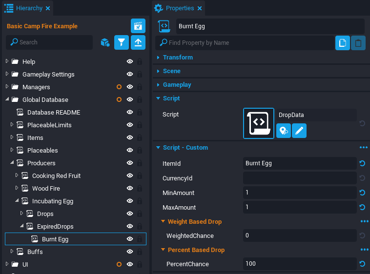 Expand the ExpiredDrops script under the Incubating Egg script. Rename the Charcoal script to Burnt Egg. Select the Burnt Egg script and open the Properties window. Set the ItemId property to Burnt Egg.