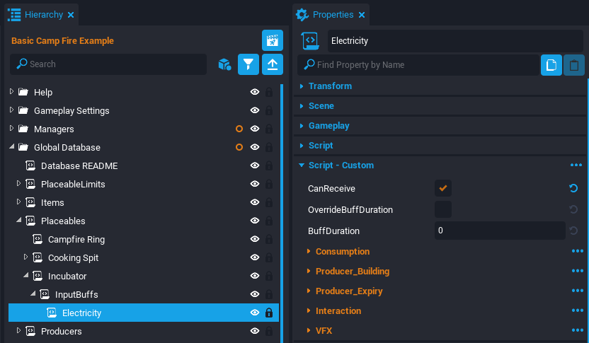 The Producers, Buffs, and Areas Example Project allows creators to design games around producers which transform items into different items over time, buffs which provide customizable restrictions on the producers, and areas which allow the world space to be divided into distinct pieces which can be loaded on demand.