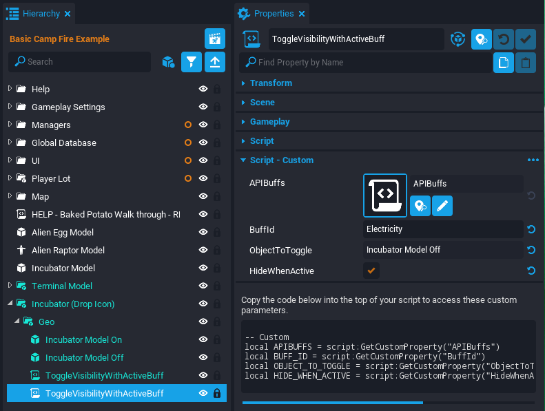 - Select the Incubating Egg script under the Producers script and open the Properties window.
