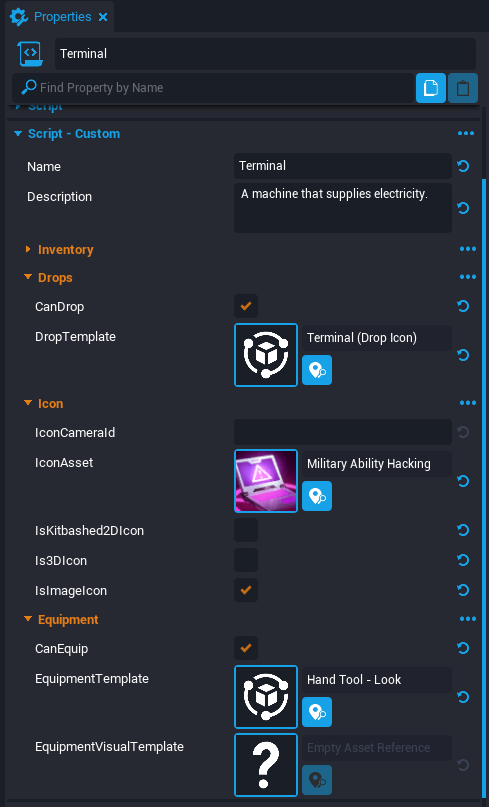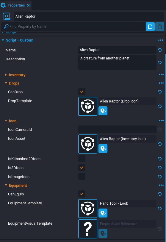 | IconAsset | The template that appears in the Inventory slot. Can be a Kitbashed 2D Icon, 3D Icon, or an Image Icon. |