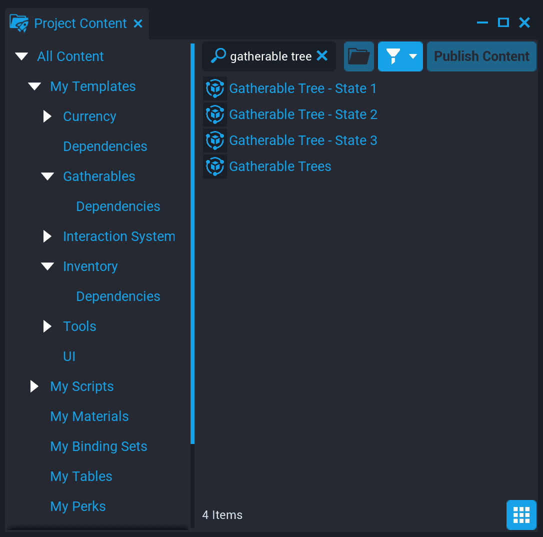 Gatherables can show up as multiple different world models as they are gathered. A Gatherable with only one state, like the Gatherable Cube disappears when it is gathered, whereas others, like Gatherable Trees and Gatherable Stones change their appearance each time they are gathered. To find an example of how these can look, search for Gatherable Tree in Project Content to find the three different models used as the tree is gathered.