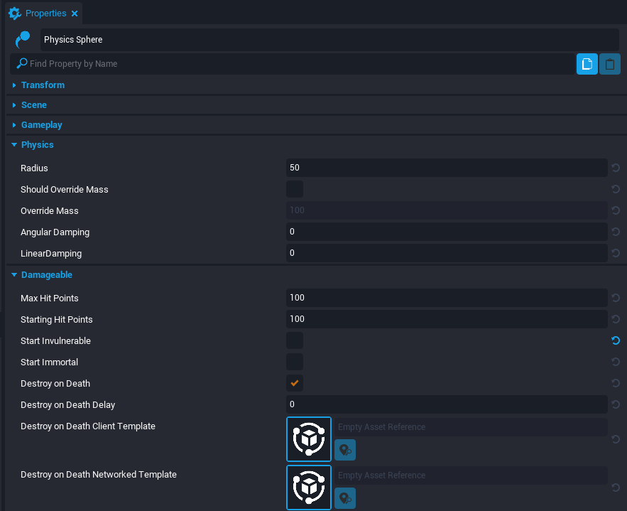 | Destroy on Death Networked TemplateId | Spawns a networked template at the location of the Damageable after the death delay. This is useful for spawning gameplay from a destroyed Damageable. |