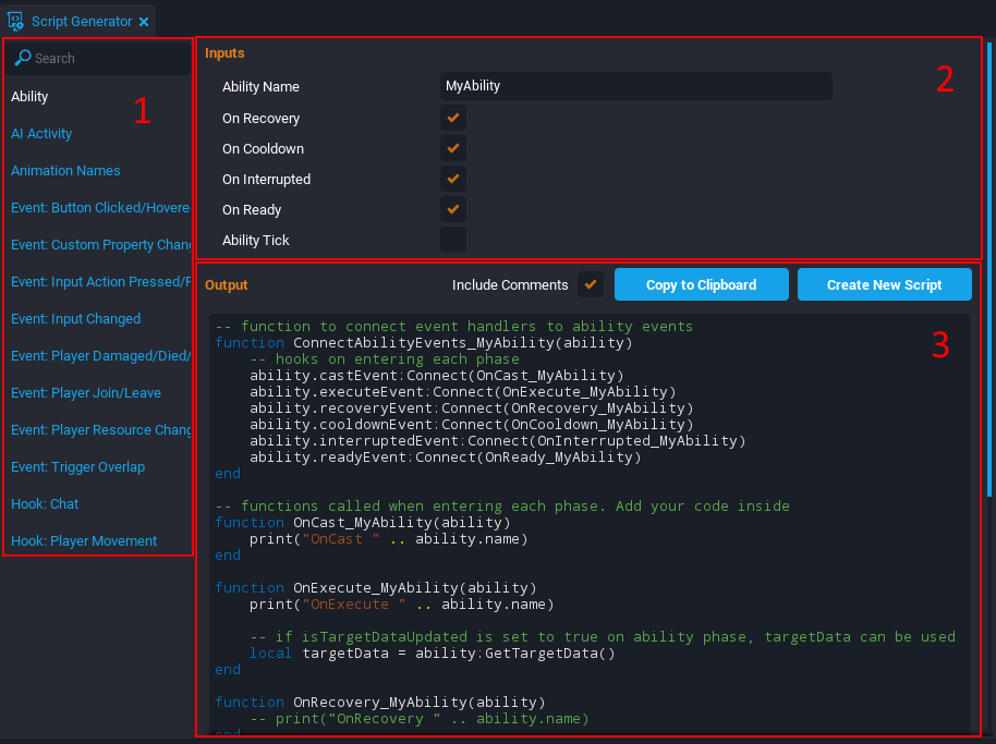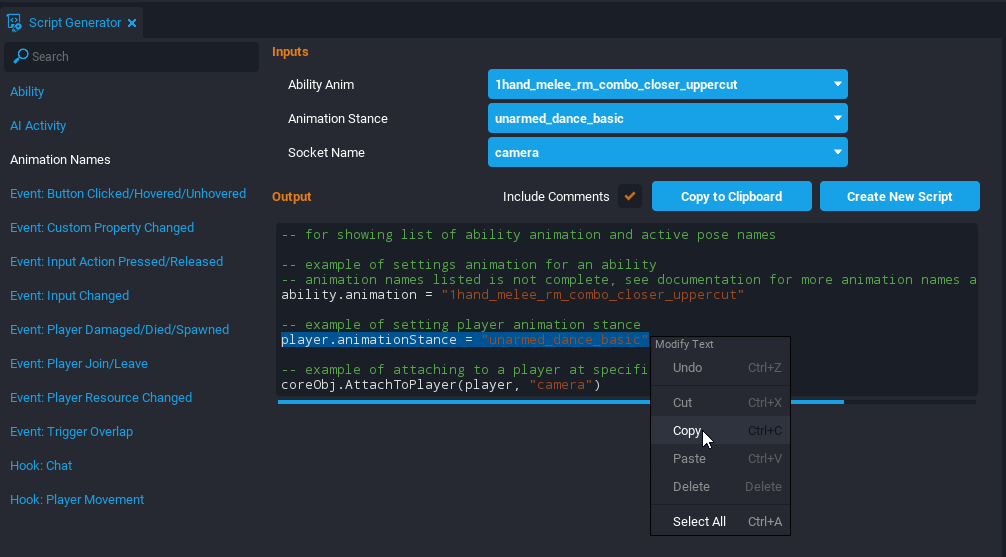 Depending on the type of script, there may be options available to change the script to a creator's preference. One example is the Ability script type has options to include or exclude functions that connect to certain ability events. Another example is the Animation Names script type has a dropdown menu to choose an animation stance for the player.