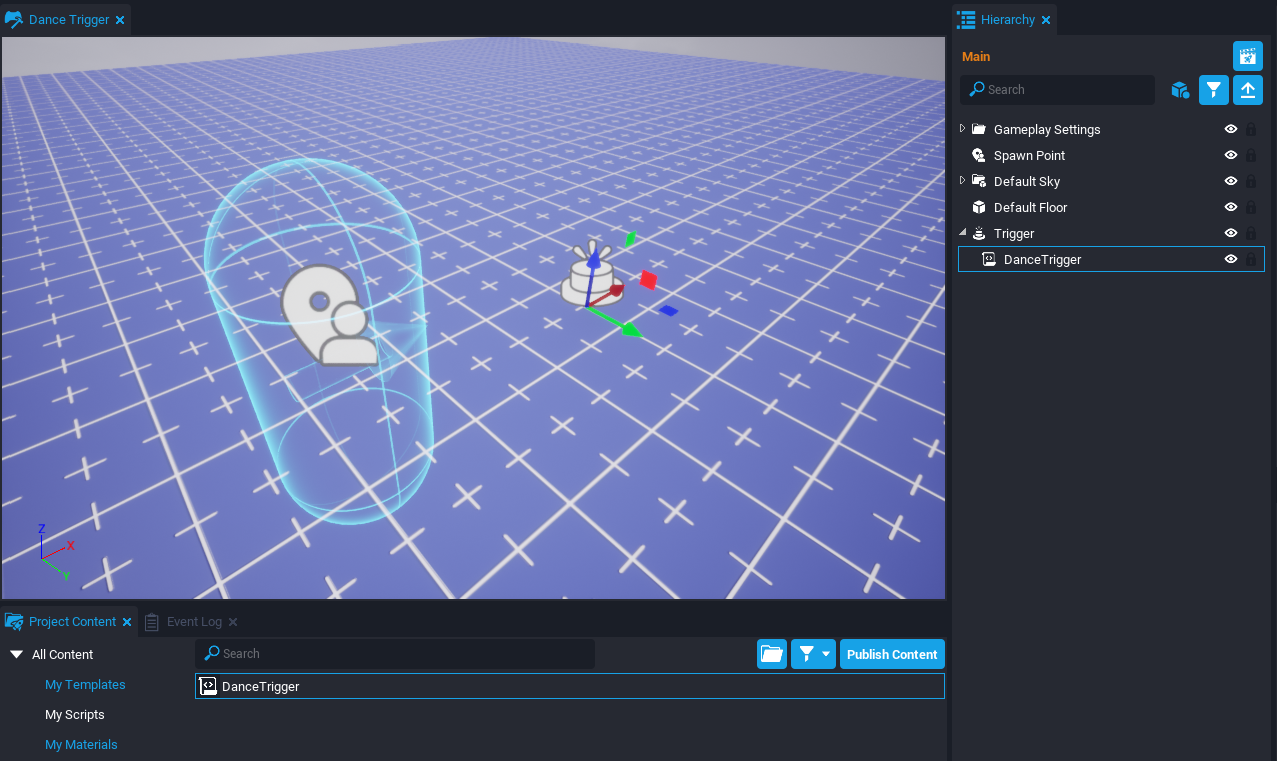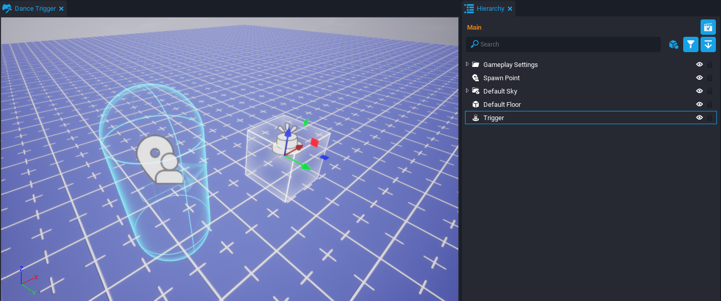 This example will be using the Script Generator to make a script that uses a Trigger to change a player's animation stance. The player starts dancing when it enters the trigger and stops dancing when it exits the trigger.