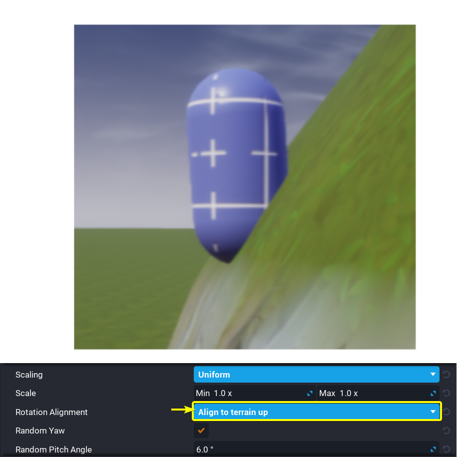 The Surface Alignment property determines how the foliage will be oriented when generated. There are three different alignment options: Align to terrain Up, Align to surface, and Random Align. The Align to terrain Up option will align the foliage with the z-axis of the terrain. The Align to surface option will align the foliage perpendicularly to the slope of the specific point of terrain that the foliage instance is on. The Random Align will randomly assign the Align to surface or Align to terrain up for each foliage instance.