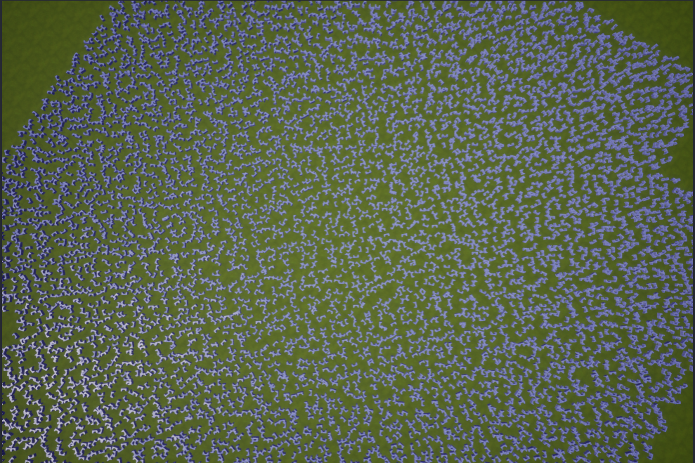The Spawn Distance setting controls the maximum distance that foliage can be rendered at. Below is a comparison between a Spawn Distance of 96 meters and 128 meters.
