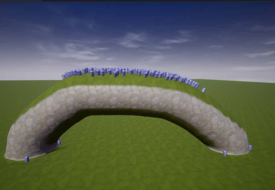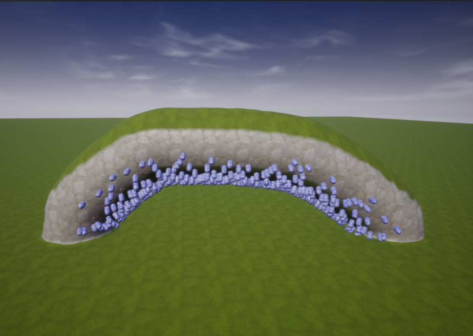The Ground Slope Angle controls the type of slope the foliage is allowed to spawn on. Ground Slope Angle can be used to prevent foliage like trees from spawning on the side of a cliffs. The Group Slope Angle property has two settings. The first setting is the minimum slope angle. The second setting is the maximum slope angle. The table below demonstrates how manipulating the first and second settings for the Ground Slop Angle property changes the locations that foliage spawns at.