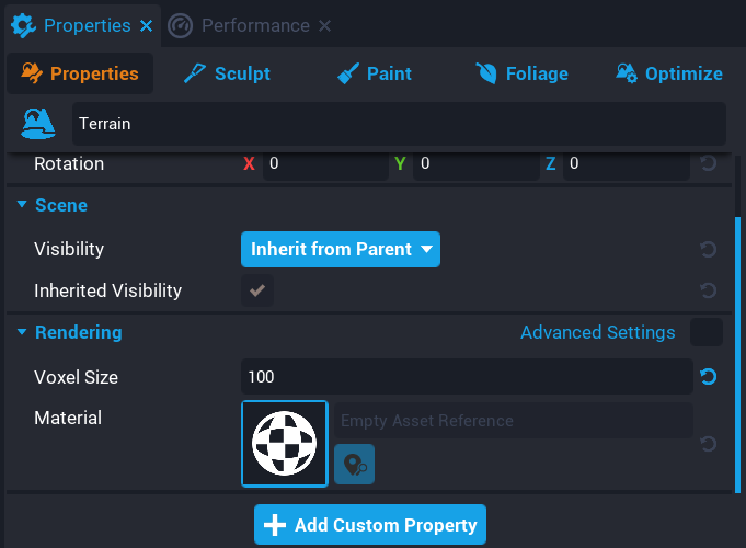The Sculpt tool is used to manually change the shape of terrain objects. Clicking on a terrain object in the Hierarchy window will display the properties of that terrain object in the Properties window. The Properties window for the terrain object contains a list of five tools modify terrain: Sculpt, Pain, Foliage, and Optimize.