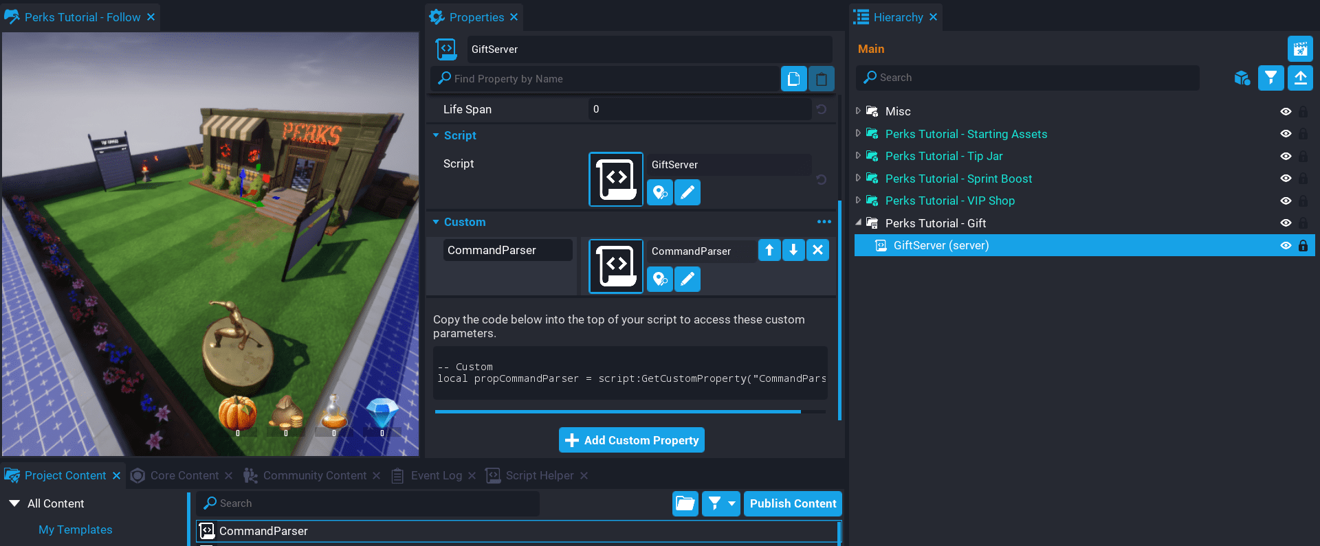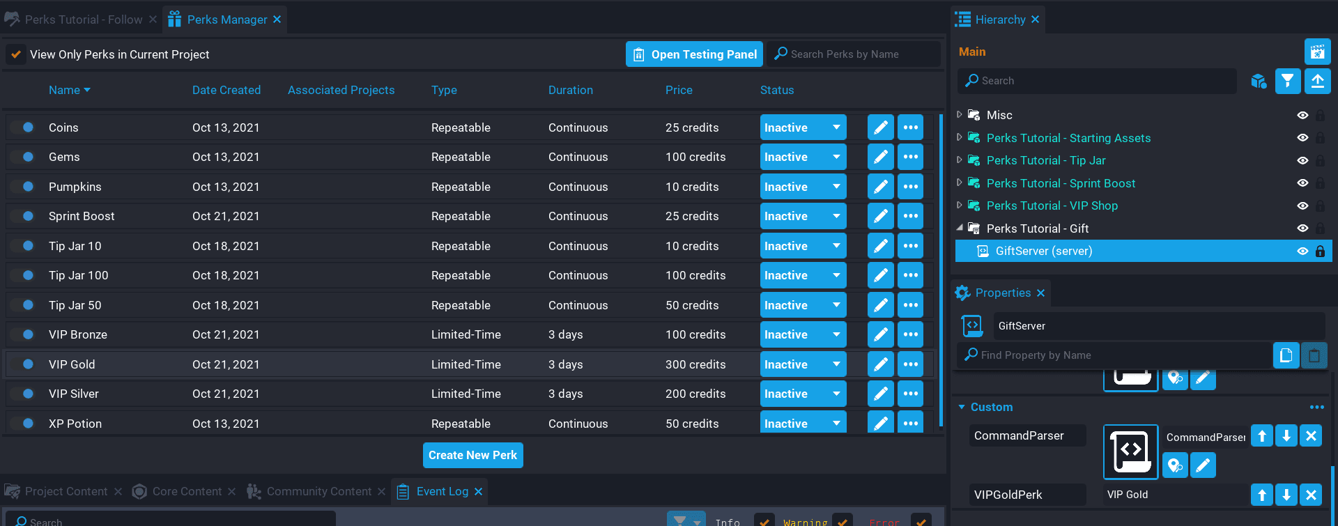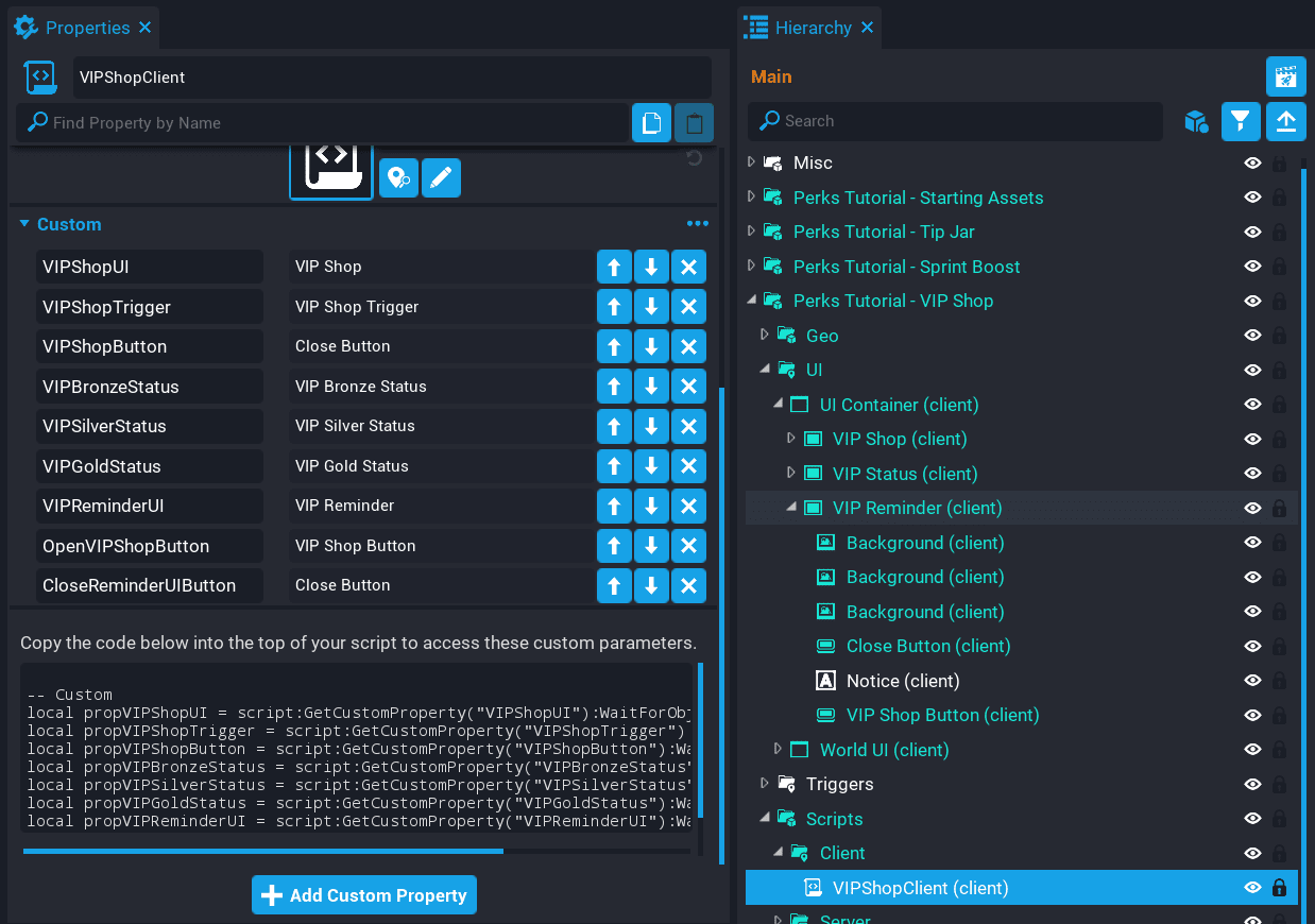 Drag the VIP Gold perk from the Perk Manager window, onto the GiftServer script as a custom property. Name the property VIPGoldPerk.