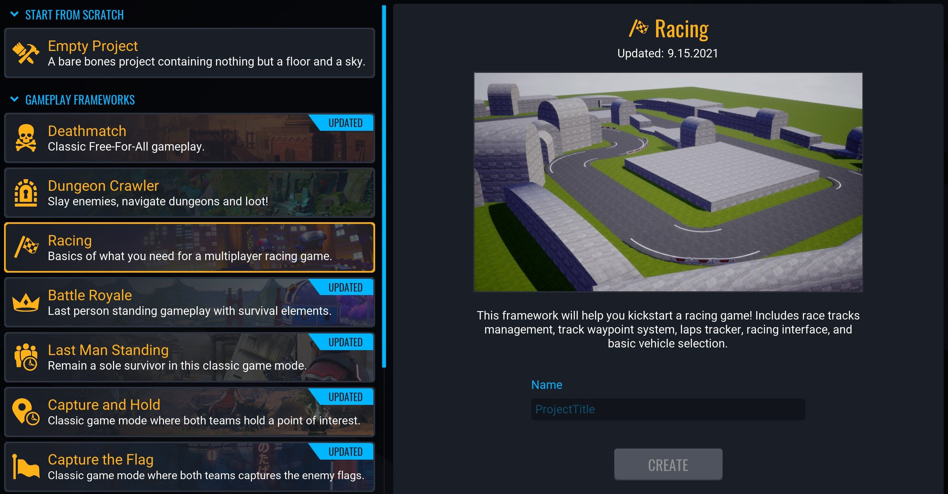 - In the GAMEPLAY FRAMEWORKS section, select Racing.